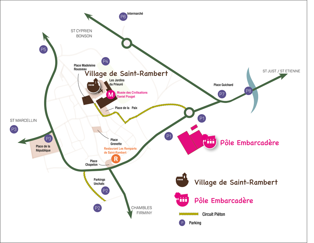 Depuis Saint-Etienne, autoroute A72, direction Roanne/Clermont Ferrand, sortie Saint-Just Saint-Rambert. Suivre ensuite Quartier Saint-Rambert et Embarcadère.